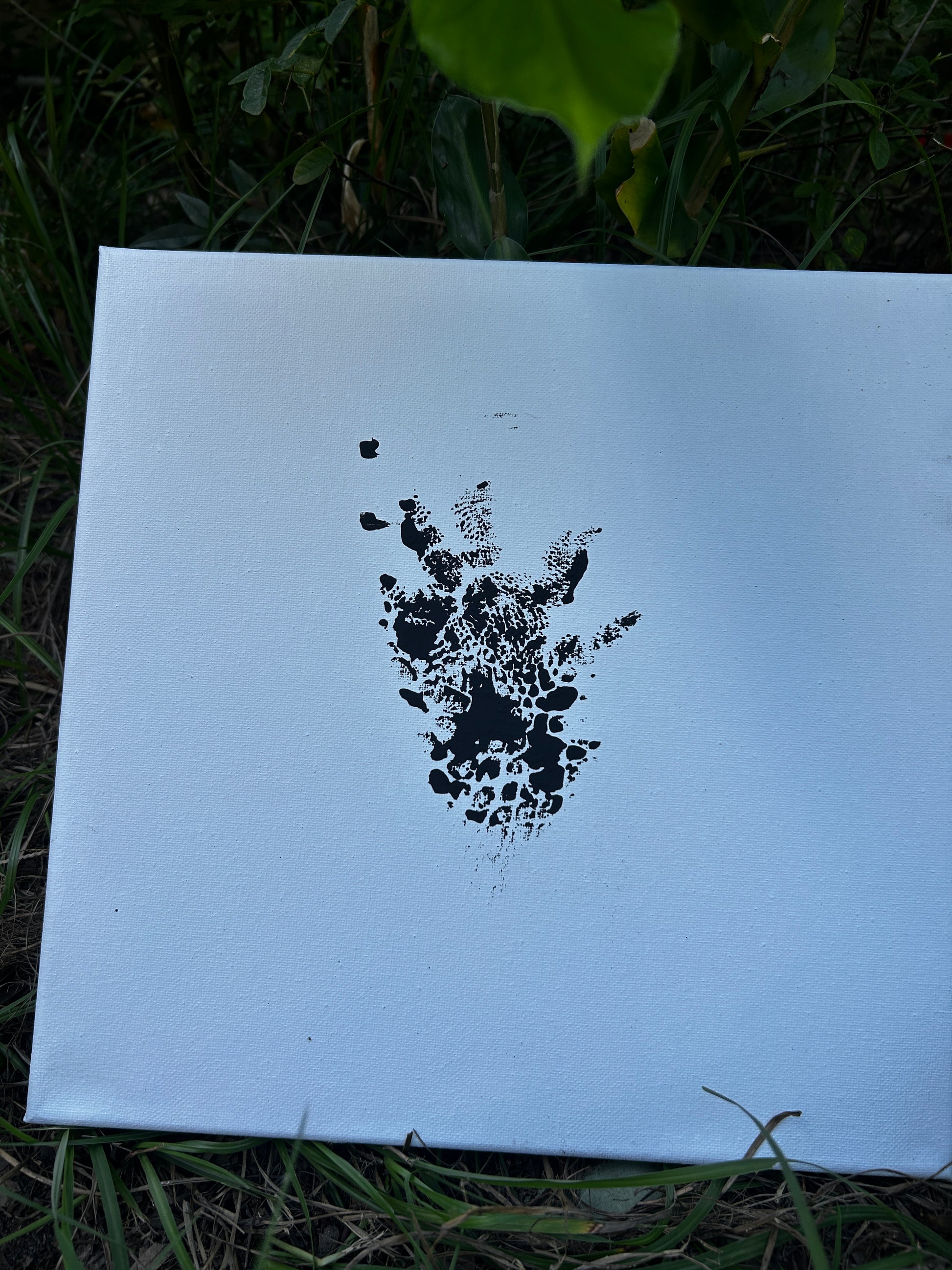 A 12x12 canvas with Angelous the crocodile's paw print in black.