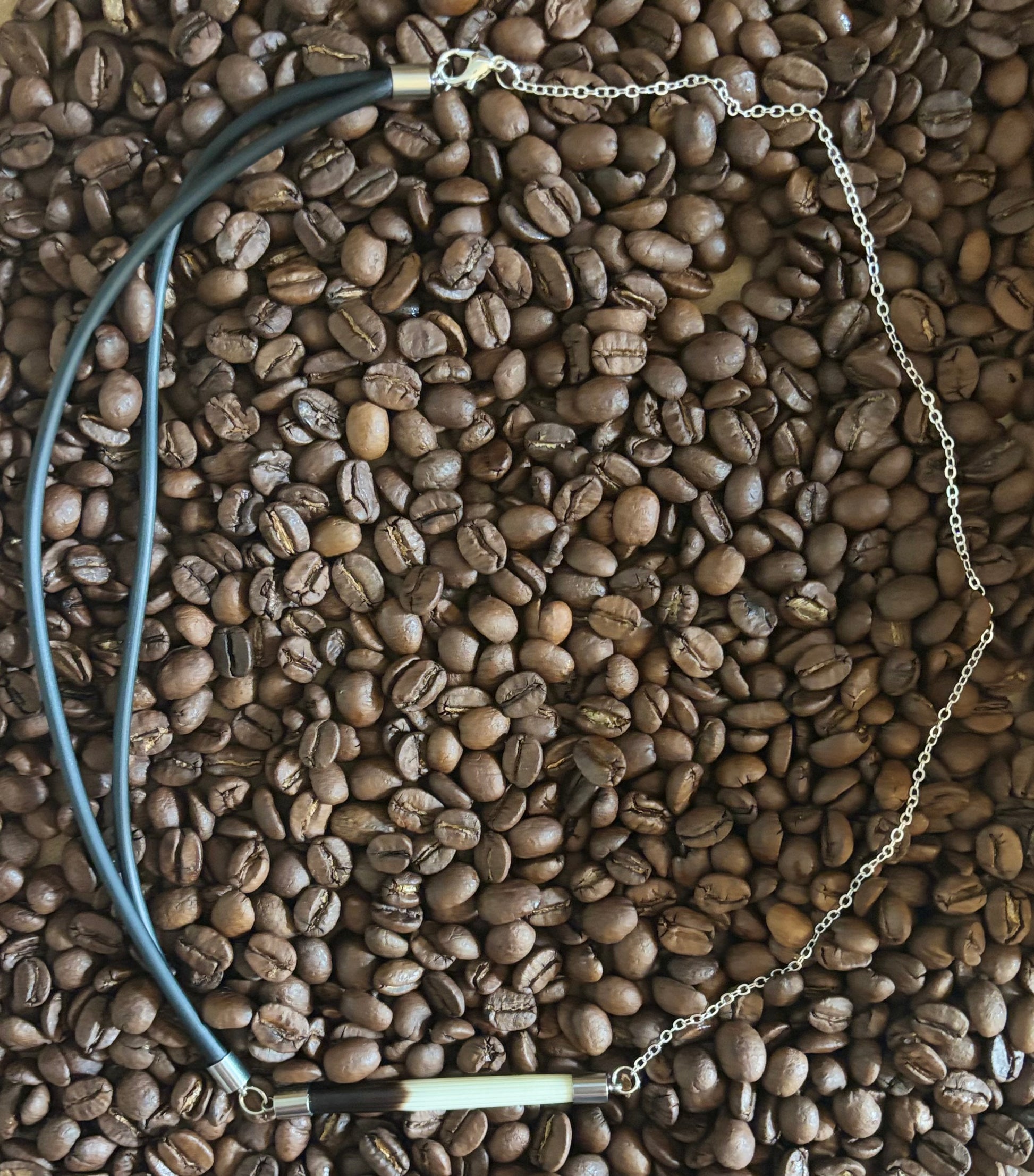 A striking play of contrast: half black rubber tubing, half stainless-steel chain, finished with a porcupine quill pendant. Modern and primal in equal measure, this design embodies strength and balance.